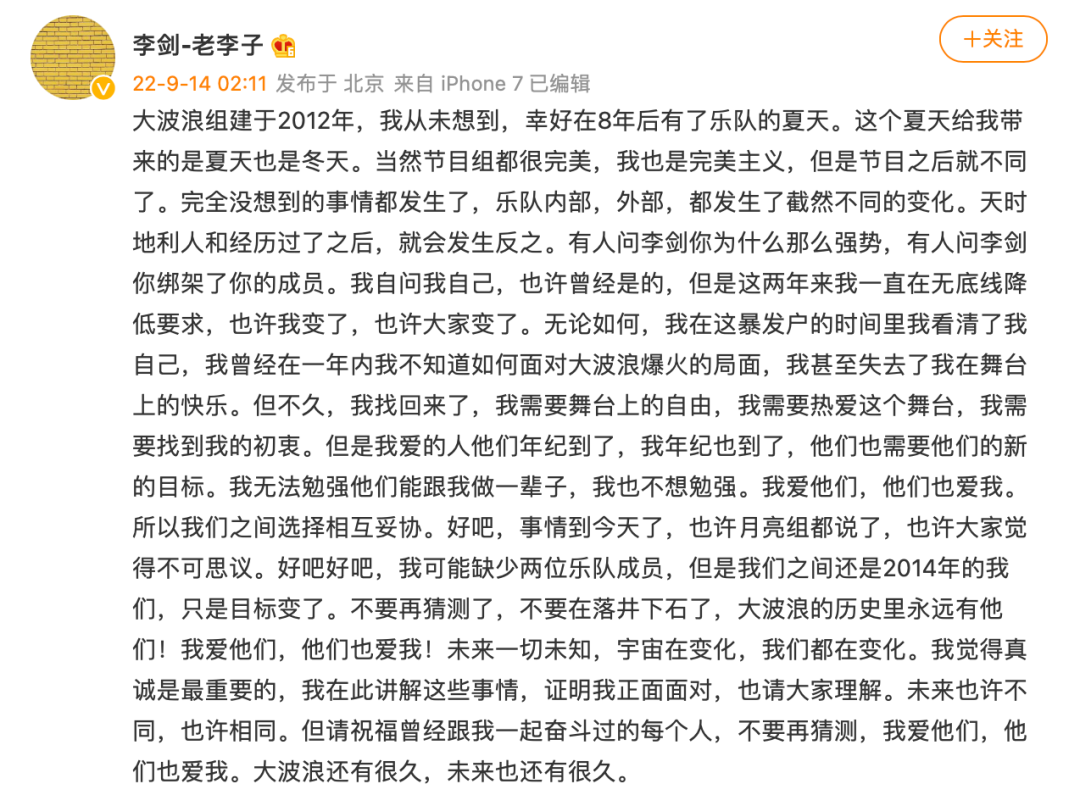8月9日凌晨,大波浪乐队官博更新,说了这样一段话:“一起回归到起点,大波浪乐队需要休息,再完美的团队也经不住不一样的心。”半小时后,李剑转发该微博,并表示“这两年一起都变了,也许下一步是新的开始,也许是结束。沟通到最后无解的时候,除了漫长的等待,还有一个办法就是——破釜沉舟!”