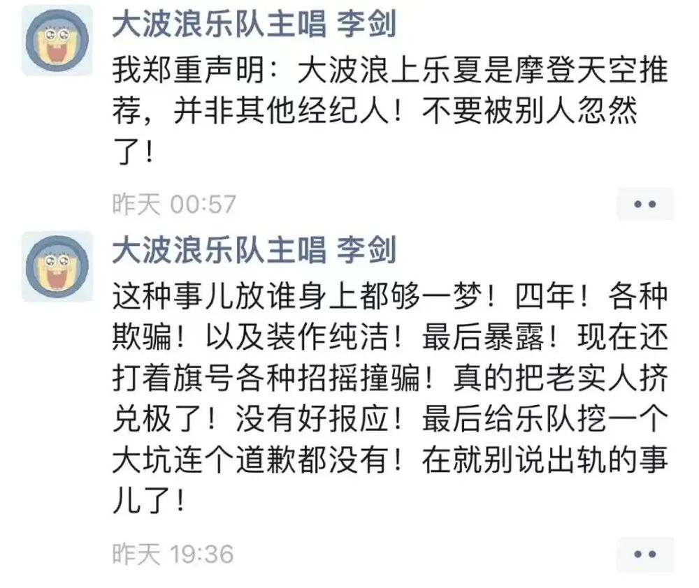 此后,刘嘉慧又发布三张与李剑的聊天截图,对话中,李剑这样说道:“现在最重要的是把价格提上去”,“如果一场一万,三个人,雇佣,你算吧,啥样的找不到”。由此可见,李剑是大波浪乐队的老板,其他乐手都是李剑雇佣而来的,而李剑不打算给他们更多的露出。对于未来的新乐手,李剑的态度是“就算加入乐队,也不分比例”。