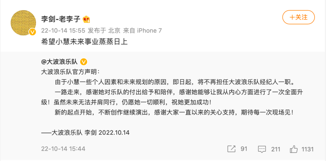 在确认两名成员离队之后,10月14日,李剑宣布刘嘉慧不再担任大波浪乐队经纪人。当时李剑还祝福刘嘉慧未来事业蒸蒸日上,看上去是和平分开,然而事实并非如此。