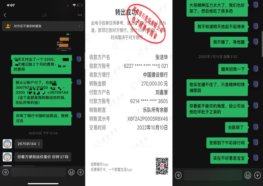 刘嘉慧指李剑对乐队的财务处理不明晰,还贴出对话和流水,显示李剑挪用公款近30万买房,刘嘉慧还曝光了一组对话,显示李剑吃药自杀,因此缺席工作。