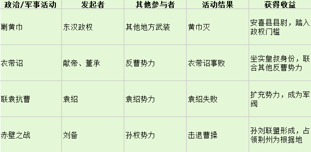 上表列出了东汉末年影响各方势力格局的重要政治/军事活动。不难看出,刘备无一例外的出席了这些重要的活动,而且实质上都承担着配角甚至龙套(包括由他自己主动发起的赤壁之战)。然而无一例外的是,无论活动成功与否刘备都从活动中取得了很大的收获,而且从时间次序来看,刘备在活动中的参与感和地位都在逐次的增强。这反映出刘备刷脸还是刷的很成功的。