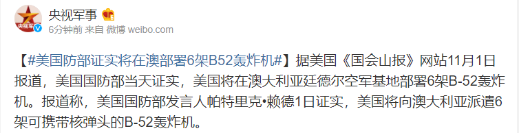 @央视军事 微博11月2日消息,据美国《国会山报》网站11月1日报道,美国国防部当天证实,美国将在澳大利亚廷德尔空军基地部署6架B-52轰炸机。报道称,美国国防部发言人帕特里克•赖德1日证实,美国将向澳大利亚派遣6架可携带核弹头的B-52轰炸机。