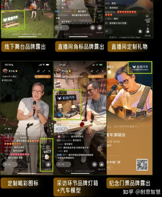 汽车品牌尤其偏爱线上演唱会:西城男孩演唱会获得高端汽车品牌林肯赞助;崔健、罗大佑演唱会得到汽车品牌极狐赞助;李健演唱会每首歌的开场,都能看出的一汽大众的身影;