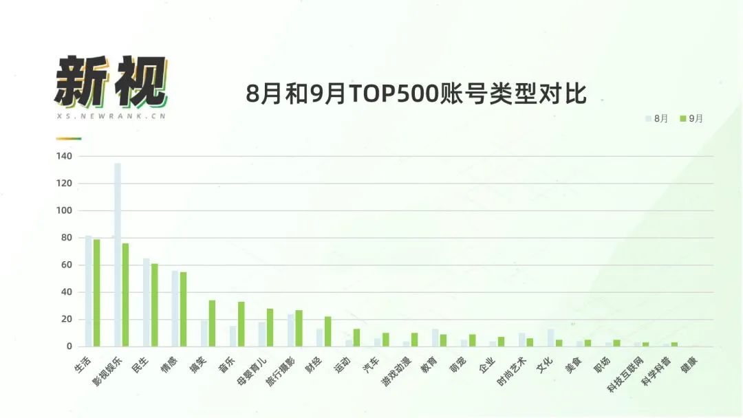 基于此,在视频号今年的TOP500账号类型之中,生活、影视娱乐、音乐账户数目保持着较快速度的增长。
