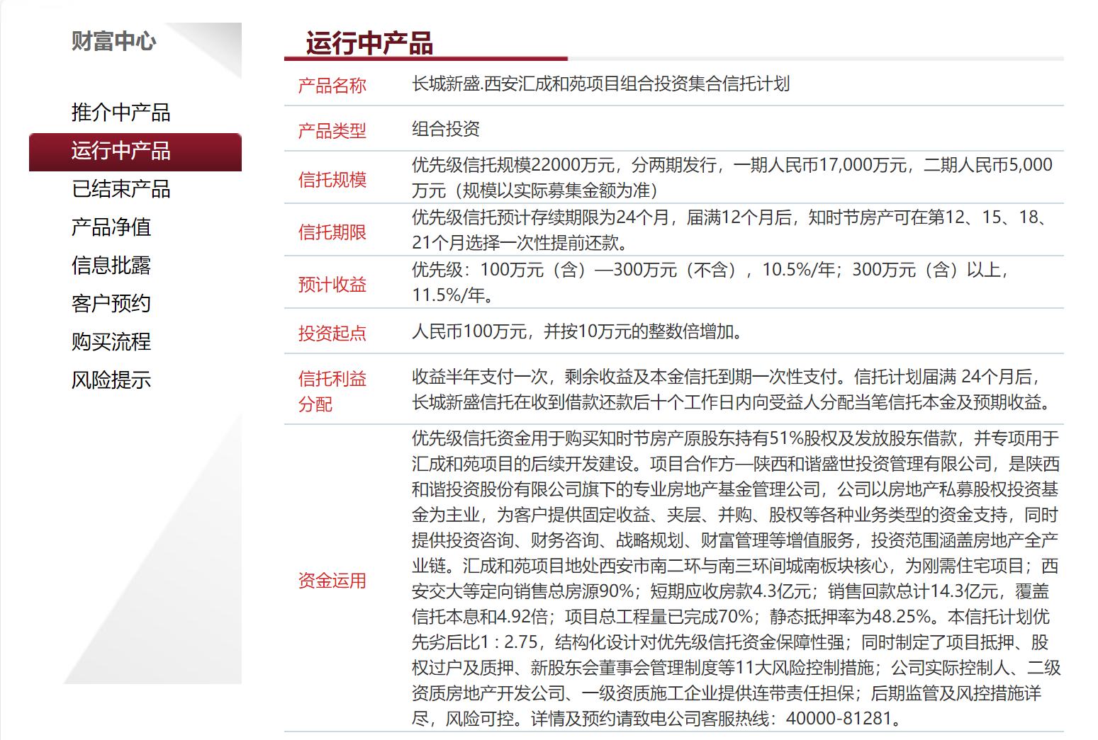 长城新盛信托官网显示,西安汇成和苑项目信托是一只运行中产品,优先级信托规模2.2亿元,分两期发行,一期1.7亿元,二期5000万元,预计收益率10.5%/年-11.5%/年。信托资金用于购买知时节地产原股东持有51%股权及发放股东借款,并专项用于汇成和苑项目的后续开发建设。