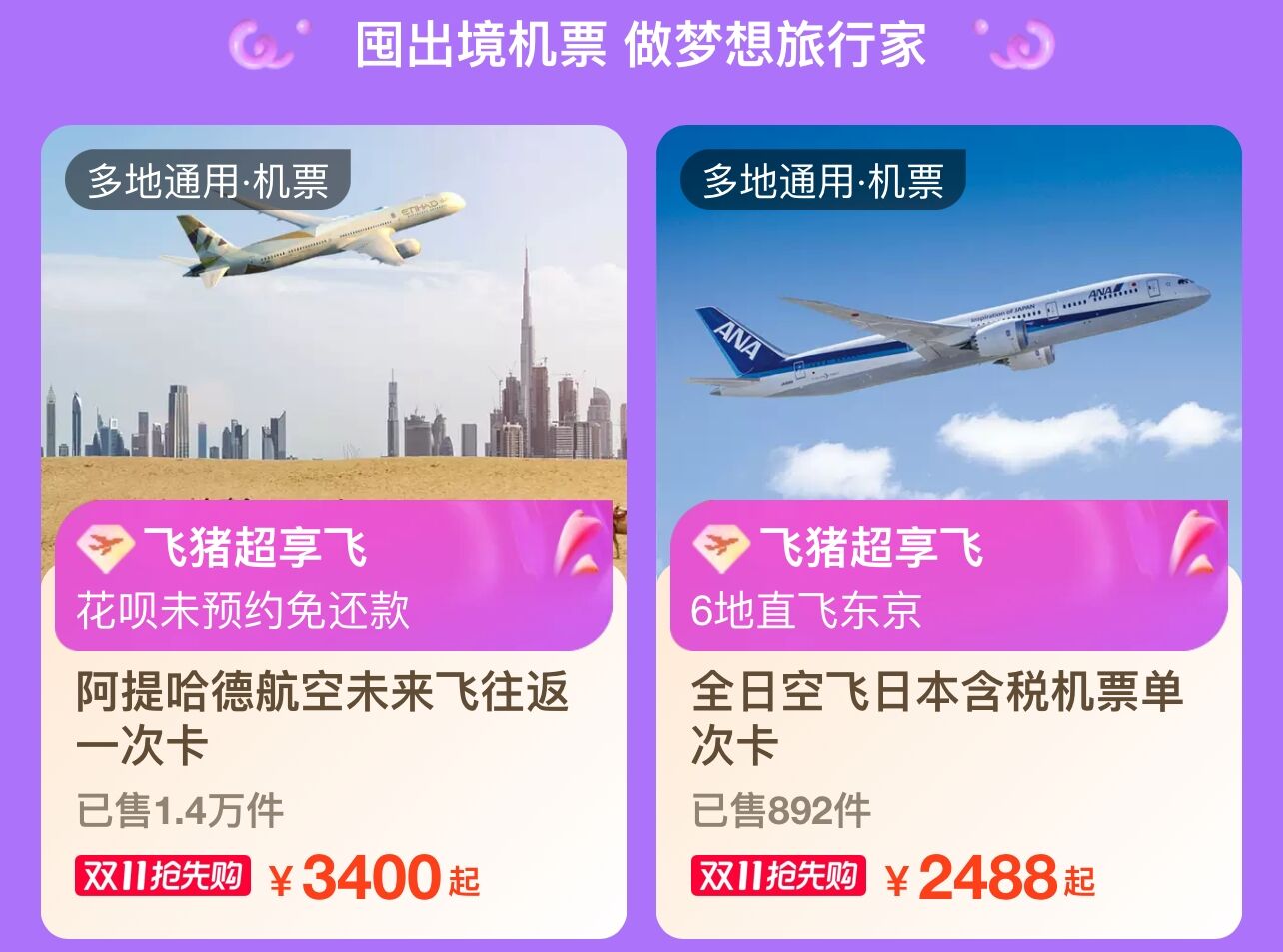 今年双十一,不少国外航空公司也参与到机票产品创新中,推出国际航线版“未来飞”产品,目的地涵盖美国、英国、马尔代夫、巴厘岛等多地。