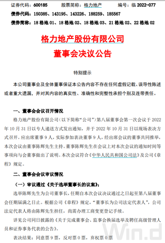 10月31日,格力地产(600185.SH)发布公告称,选举陈辉为公司董事长,同时由陈辉还将担任公司法定代表人,但尚需办理工商变更登记手续。