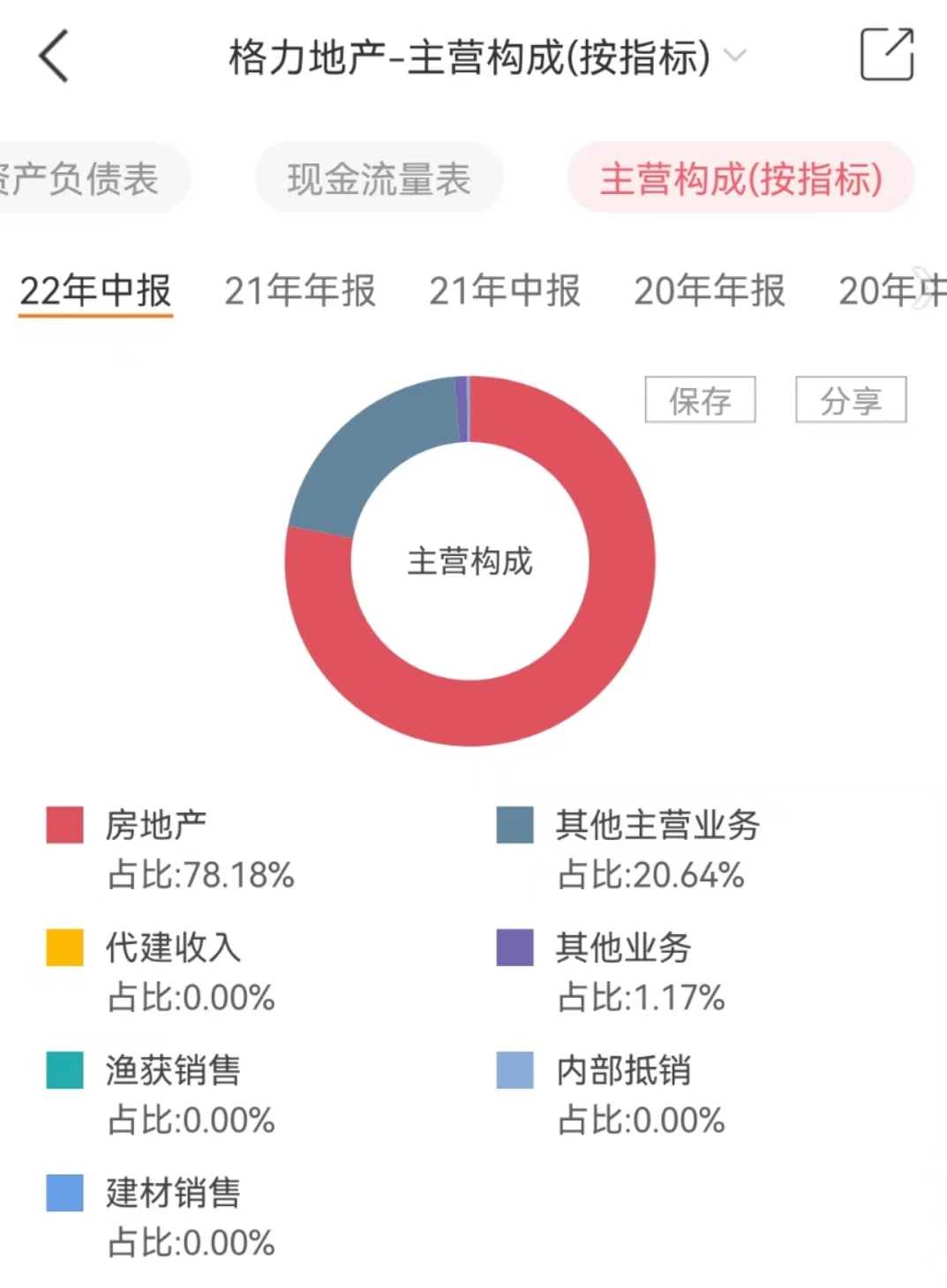 然而,从成效来看,格力地产房地产业务仍占据主力。2021年,格力地产的房地产业务实现营收63.81亿元,同比增长20.4%,在总收入中占比达89.64%;2022年上半年,格力地产来自房地产开发业务的营收贡献比依旧高达78.18%。
