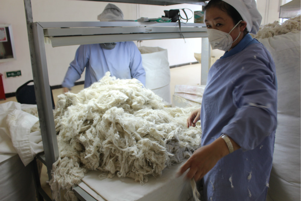 工人们之间会有讨论。在羊毛分梳车间,一位女工向界面坦言产品线的增加让她们这些年的工作翻了无数倍,“以前一天分20多公斤,现在要分130多公斤。” 但一起工作的姐妹50人在厂子里待了30年,她们一起从少女变成了外婆。