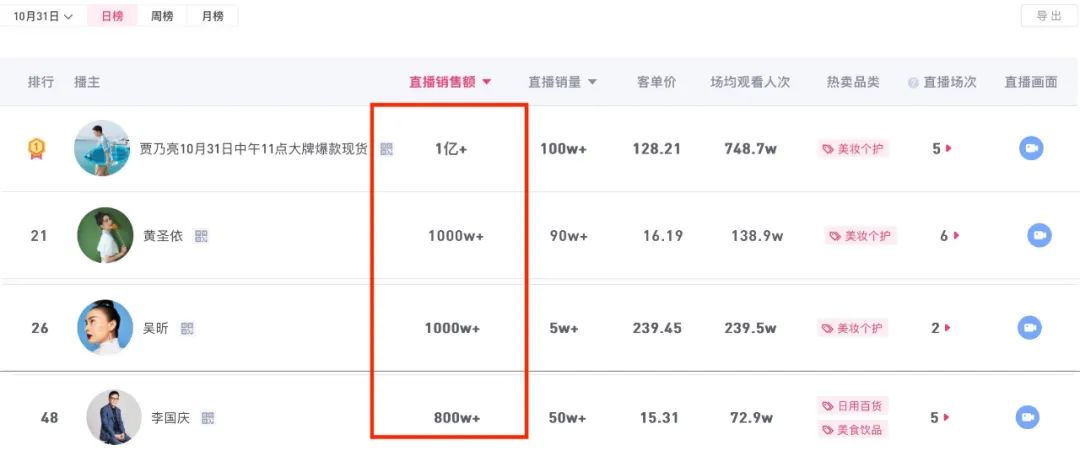 灰豚数据10月31日带货日榜