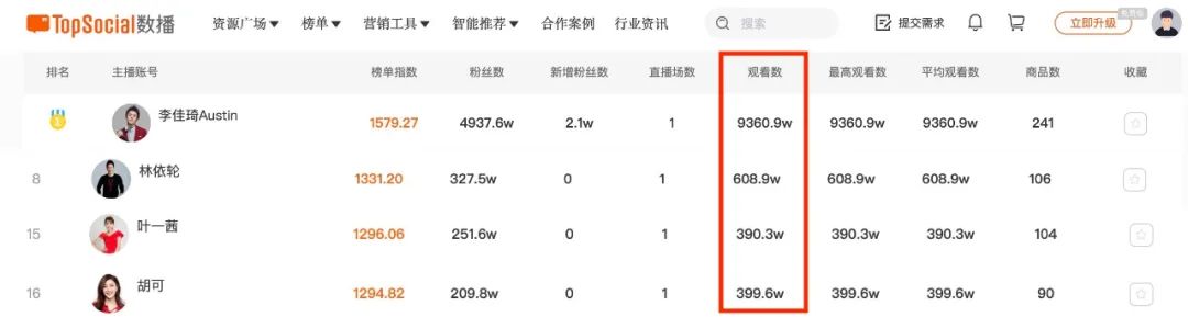 而TopSocial数播记录的10月31日淘宝主播热度榜显示,被观看数突破9360.9w的“淘宝一哥”李佳琦远甩在身后,排名第8的林依轮直播观看数仅有608.9w,勉强上榜Top20的叶一茜和胡可的直播观看数则仅有300w左右。