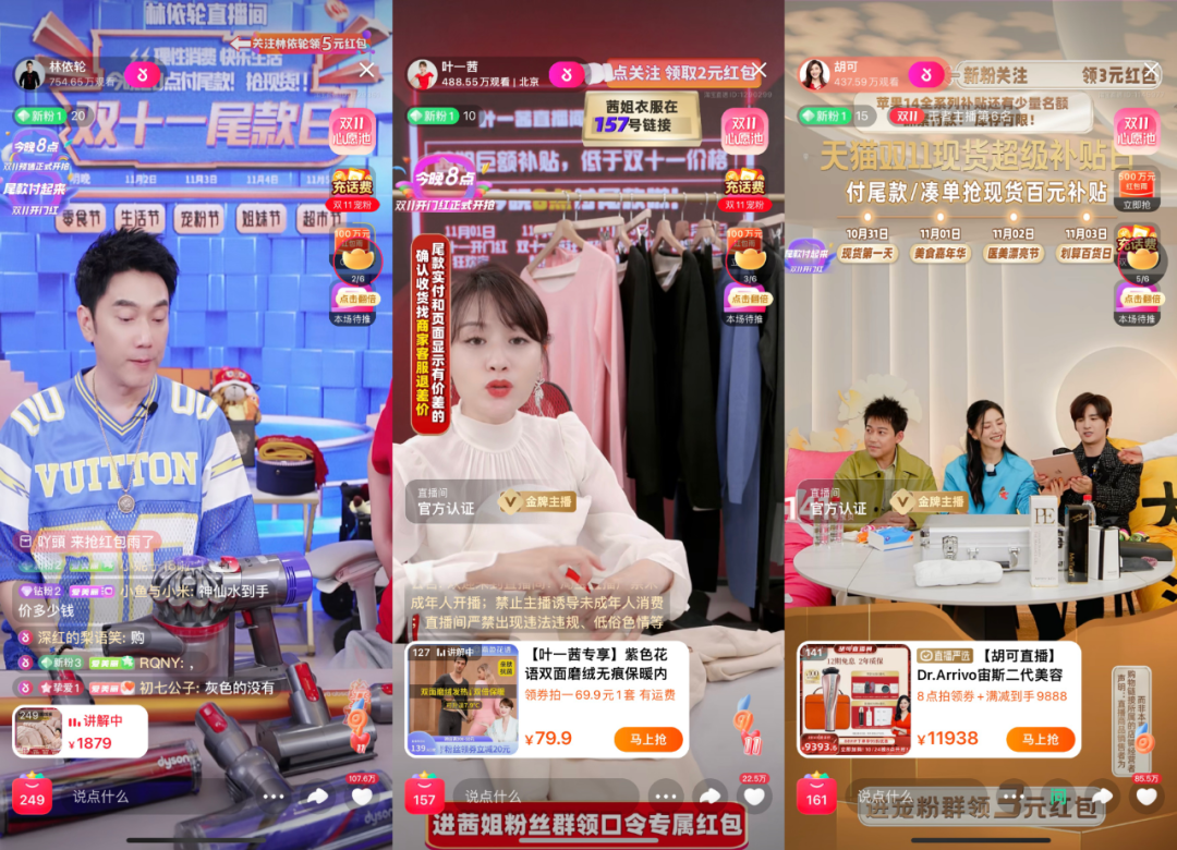 在淘宝直播生态里,林依轮、叶一茜、吉杰等艺人都已经是常态化驻扎此平台开播的“职业主播”,此番双11首日(10月31日)林依轮、叶一茜的直播间都曾冲上过首页,而往常直播频率不高的胡可则因为邀到“再就业男团”的苏醒、张远在双11表现抢眼。