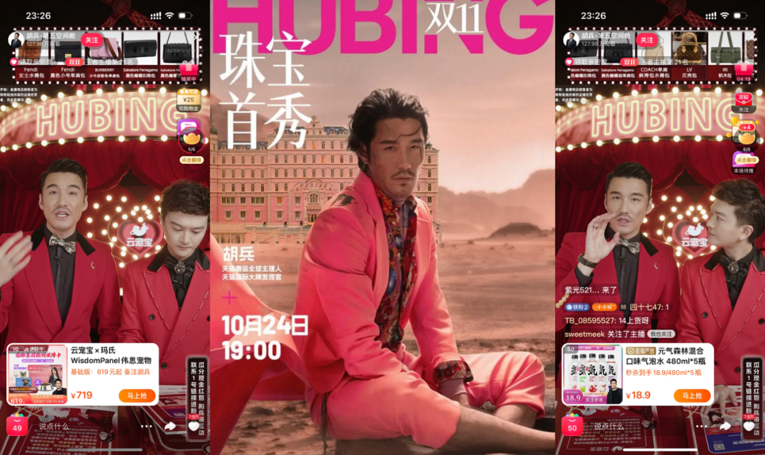 我们还发现,今年双11的明星直播呈现出内容多元的趋向。比如“不老男神”胡兵的淘宝直播间被打造成韦斯·安德森《布达佩斯大饭店》的色调风格,呼应珠宝场的悦己主题,这种视觉风格独树一帜的直播间能令消费者眼前一亮。