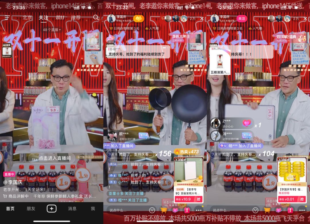 再比如,李国庆的抖音直播间走起“快走货”路线,他与女主播一唱一和,女主播负责介绍选品,李国庆负责报出“跳楼价”并迅速摆上商品链接,观众秒抢到就是赚到,这种上品密集、节奏飞快的直播间风格也是打出了差异化。