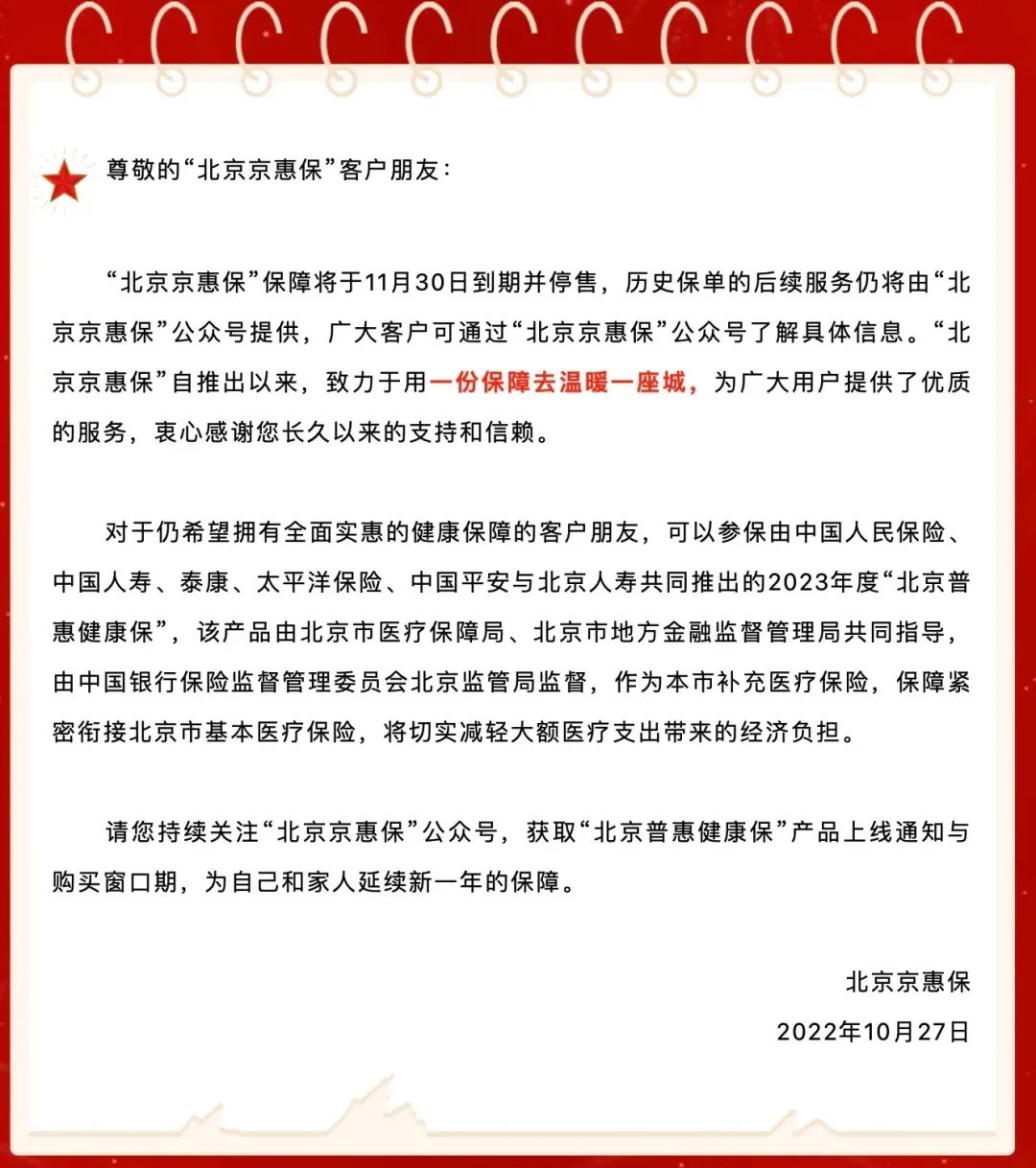 10月27日,“北京京惠保”公告称,该产品将于11月30日到期并停售,历史保单后续相关服务将由“北京京惠保”的公众号提供。