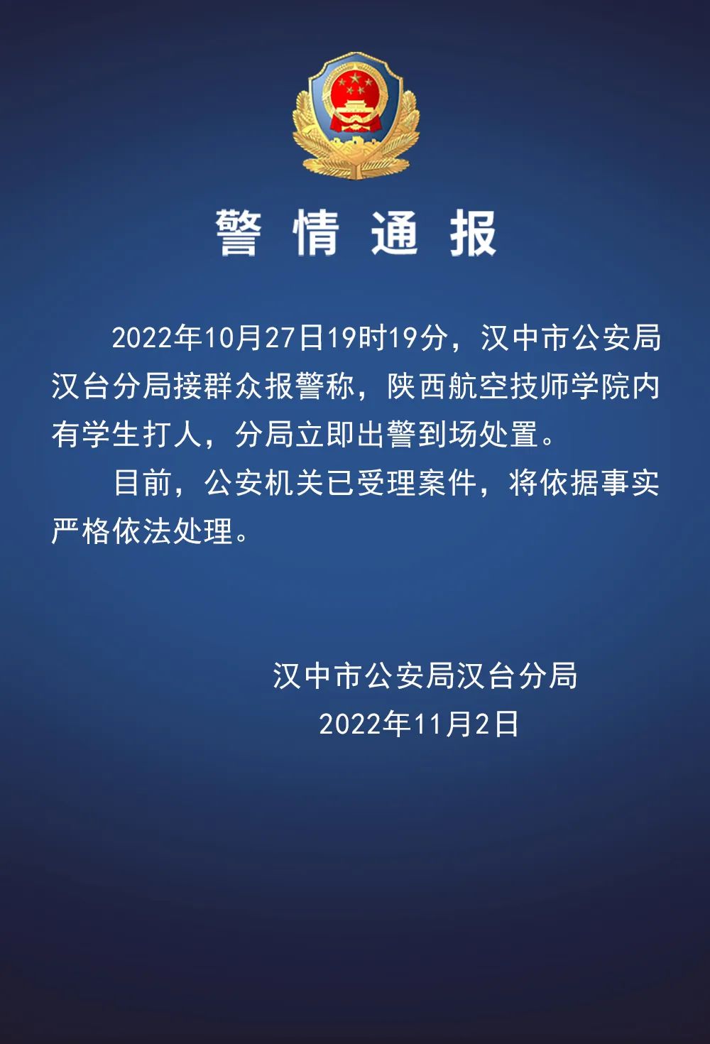 近日,网传陕西航空职业技术学院3名学生在校园被电棍击伤。“汉台公安”微信公众号11月2日消息,陕西汉中公安局汉台分局通报,10月27日19时19分,汉中市公安局汉台分局接群众报警称,陕西航空技师学院内有学生打人,分局立即出警到场处置。目前,公安机关已受理案件,将依据事实严格依法处理。