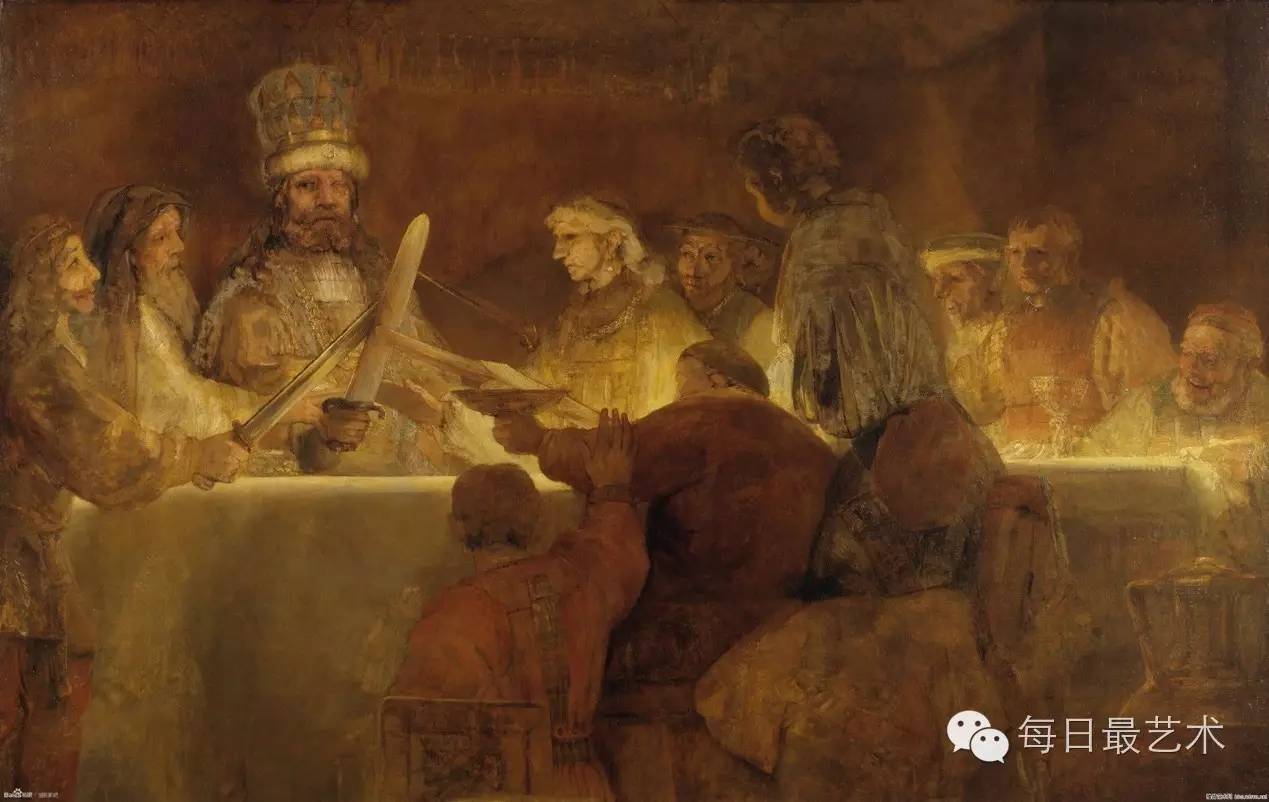 本来晚年的伦勃朗有一次翻身的机会,阿姆斯特丹的新市政厅委托他以荷兰建国主题为内容作一幅大画,结果画好了雇主又不满意,画风太粗旷,看起来像是没完成,所以雇主不掏钱了。伦勃朗也没办法啊,穷啊,为了卖些钱,就把这幅大画作狠心裁开,剩下那五分之一,看看能不能卖了换回些钱。为了自由,他成就了伟大艺术家的身份,可惜当时的荷兰人理解不了,所以,他穷死了。