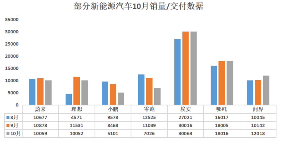 华夏能源网获悉,近日,新能源车10月销量相继出炉,广汽旗下的埃安以月销超3万辆的数据跃居榜首,哪吒和问界分列二三位,而造车新势力“蔚小理”则跌入第二梯队,小鹏汽车(HK:09868)交付量更是腰斩到5101辆,这样的变化此前大家没有预料到的。