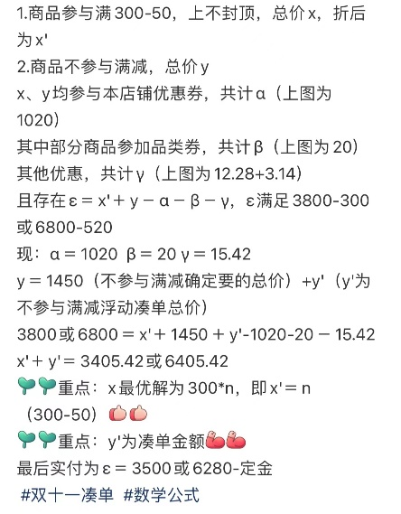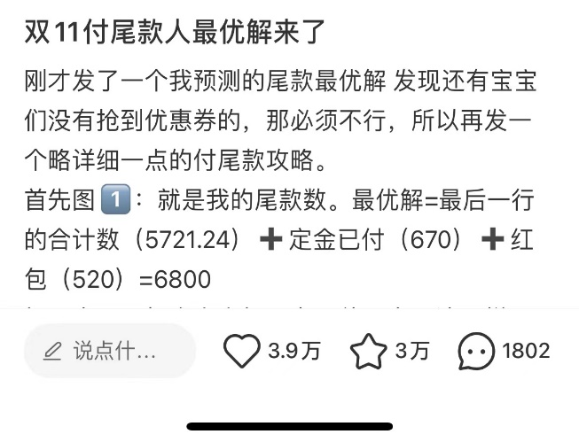 购物狂热党们将双十一视为一场一年一度的大考,需求是次要的,重点是挖掘一切折扣,将一切满减利用到极致,甚至成为追求数字最低的执念。在小红书等购物分享平台上不乏有这样的讨论,争论双十一尾款的最优解是6800元还是3500元,比较原价价格与实际到手之间的差异高低获得满足感。购物爱好者们热衷在社交平台分享这种“神价”“史低价”,获得的不仅仅是物品带来的使用价值,更多的是价格数字本身带来的精神满足。