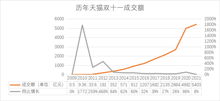 历年天猫双十一成交额持续增长,但在数据对比中还是难掩疲态。