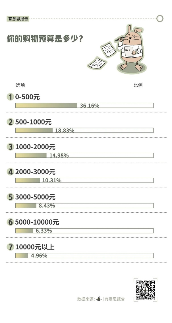 当然,更多的消费者游移在两者之间,下单不一定最快,价格不一定是最低,总得凑个热闹,或许已经成为很多人的消费心态。有意思报告在今年发起了消费者购物计划和消费态度的调查,结果显示七成人依然对双11抱有热情,四成人预算减少30%2,可见,双十一作为购物节日已经深入人心,但在购物需求上有所收制。在品类上,彩妆护肤、服饰鞋包、家居用品位列TOP3,也与往年双十一品类需求基本一致。