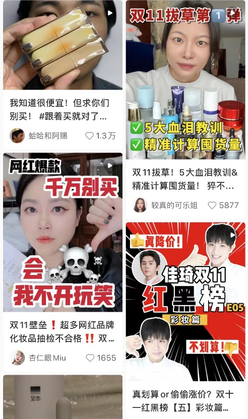 除了价格攻略和种草视频,今年的双十一攻略中也涌现出更多博主从助燃热情到倡导理性购物,从产品和价格两个层面分析产品是否值得购买。在李佳琦直播间选品价格预热后,衍生出不少视频和文章,分析对比直播间价格与免税店渠道价格,提醒消费者购买最合适的购物组合。更多双十一雷榜/黑榜、一句话拔草等主题贴直言不讳地指出不值得购买的产品及原因——产品品质/服务不过关、过度囤积、缺少价格优势、缺乏日常使用场景等,帮助消费者避雷。