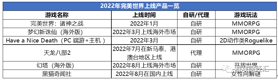 今年以来,完美世界共上线了6款游戏,其中国内市场2款,海外市场4款。
