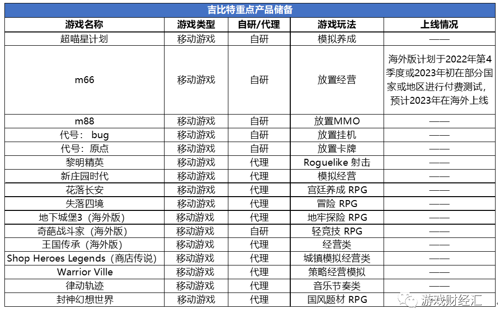 吉比特产品储备数量较多,主要以代理产品为主,游戏类型聚焦放置类、模拟经营类游戏。