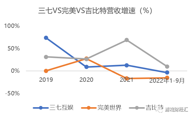 由下图可以看出,从收入增速来看,吉比特自2019年以来营收始终保持正增长,三七营收增速放缓,完美世界自21年起收入出现负增长。