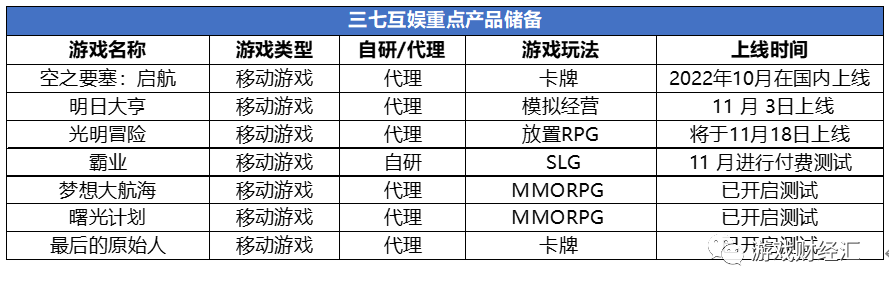 三七互娱重点储备产品以代理为主,游戏类型以MMORPG、卡牌为主。
