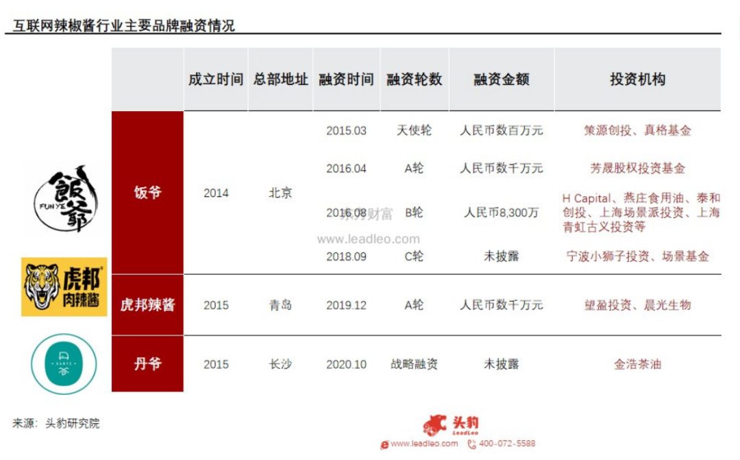 2018年9月,饭爷完成C轮融资;2019年12月,虎邦辣酱完成A轮融资;2021年川娃子、加点滋味分别完成A轮、破亿元融资。根据头豹研究院研报显示,截至2022年2月,互联网辣椒酱品牌已获得超过6笔融资。
