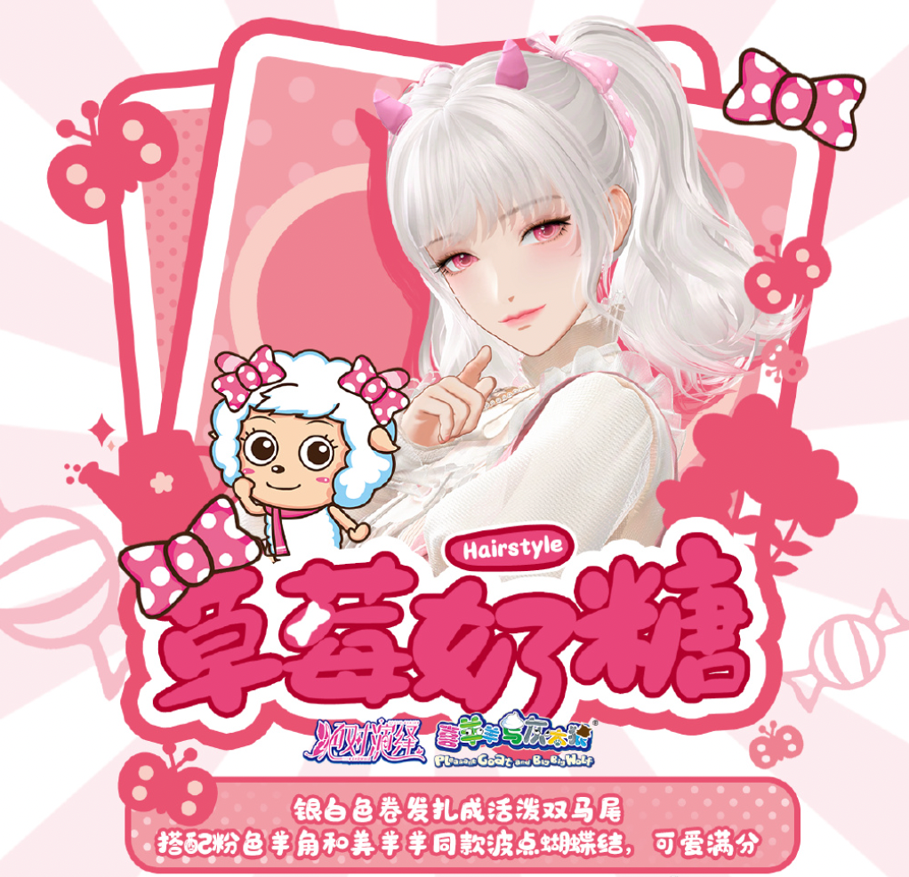 这样的联动形式就弱化了联动形象与产品风格不匹配产生的违和感,而通过体验馆的模式还能植入更多的联动活动在其中,不过,如果仅仅是这样的方式来联动,那么双方之间的联系并不能算得上深,所以为了进一步加强之间的联动性,《绝对演绎》还在游戏中加入了四款新的发型头饰,通过游戏中的造型设定来体现双方之间的联动,而在设计上也是采取了《喜羊羊与灰太狼》中的特色元素和自己产品特性的统一调性。