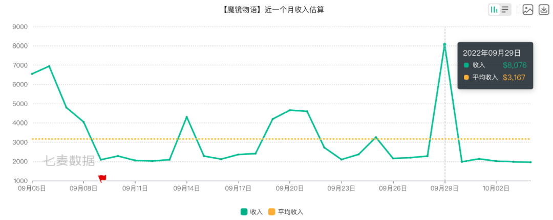 那么,ACGx根据七麦数据的估算来看,从9月28日更新,9月29日开启联动,《魔镜物语》的收入果然有了非常明显的提升。