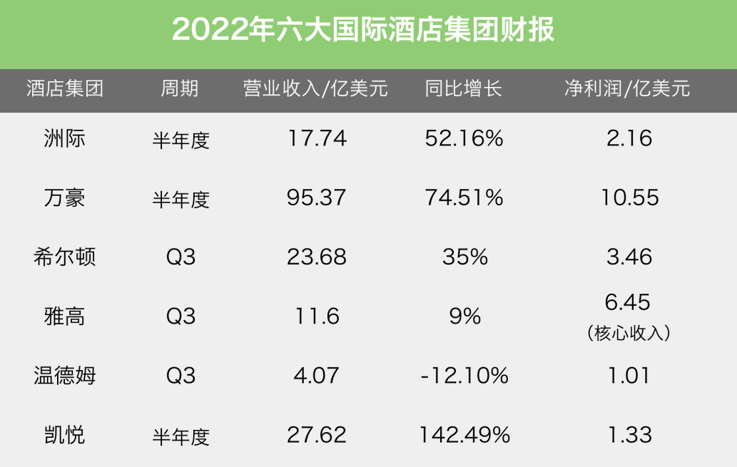 根据空间秘探不完全统计,从表中可以看到,已经公布第三季度的雅高、温德姆、希尔顿,其营业收入最高的是希尔顿,增长势头最猛,而温德姆是三家酒店中唯一一家营业收入成下跌,12.1%。而在2022年上半年的财报中,万豪的营业收入由上年的54.65亿美元增长至95.37亿美元,净利润由上年同期4.11亿美元增长至10.55亿美元,跨越式位居六大国际酒店集团之首。六大国际酒店品牌虽然在亚太地区和大中华区的表现不如欧美,但综合前五年的数据来看,总体来说,六大国际酒店集团在中国的营收情况还是稳中有进,发展态势良好,这或许是国际巨头频频在中国布局酒店的最主要原因。