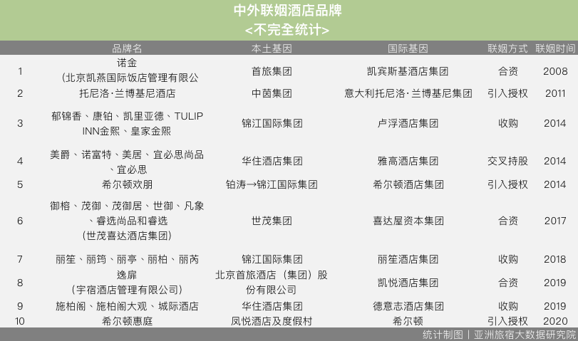 据亚洲旅宿大数据研究院不完全统计,目前本土酒店市场中,共有来自10个不同中外基因所缔造的30个联姻品牌。