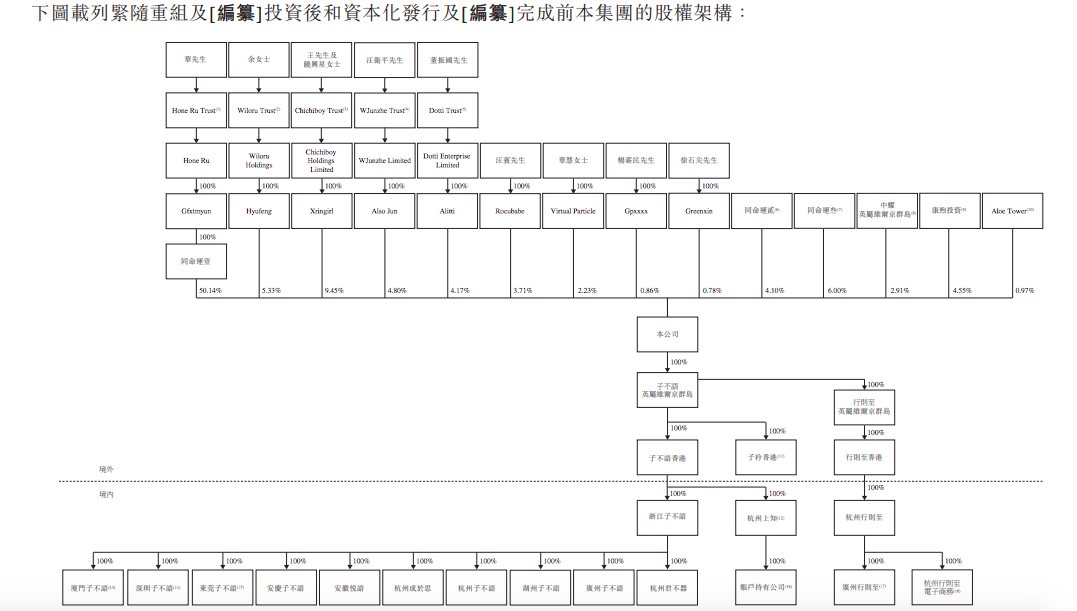 股权结构上,子不语也算是一家“夫妻店”,其创始人华丙如及其家族在其中扮演着关键角色。本次上市前,公司的控股股东为华丙如、余风夫妇,二人合计控制子不语55.47%的股份。其中华丙如的Hong Ru Trust通过Gfxtmyun、同命运壹间接持股50.14%,余风的Wiloru Trust通过Hyufeng间接持股5.33%。但与其他“夫妻店”不同的是,华丙如的妻子余风不在该公司担任任何职务。而华丙如的胞妹,非执行董事华慧则通过VirtualParticle持股2.23%。