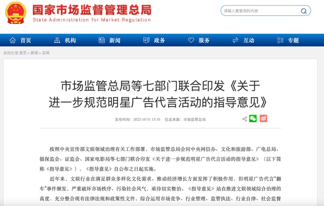 近日,市场监管总局同中央网信办、文化和旅游部、广电总局、银保监会、证监会、国家电影局等七部门联合印发等七部门联合印发《关于进一步规范明星广告代言活动的指导意见》(以下统称《指导意见》),《指导意见》自公布之日起实施。