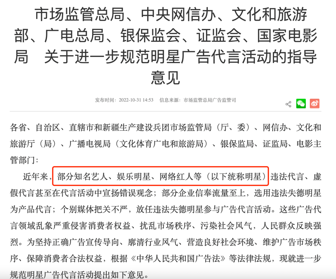 总的来说,在明星、红人翻车事件频发的当下,七部门联合发文在广告代言活动上进行规范,意味着对于红人在内的明星的监管再度收紧,而且,从此次发布的《指导意见》的细则来看,这应是针对红人在内大明星广告代言行为,所进行的一次较为全面且严格的规范。
