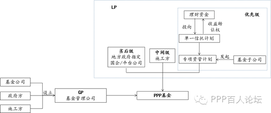 现有的PPP基金,多为有限合伙型,政府认购劣后级,享有浮动收益,承担主要风险,起到引导和带领作用;金融机构作为优先出资人,只做财务投资人,享有固定收益,参照人民币中长期贷款基础利率,承担有限风险;如基金年度收益不足以分配优先级出资人约定收益部分,由财政予以补贴。因此,本文从交易结构的角度分析有限合伙基金的构成。