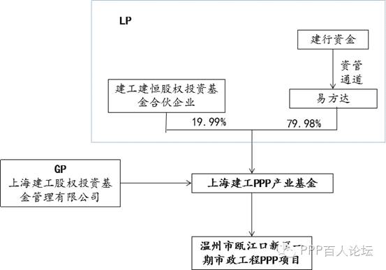 上海建工集团股份有限公司与中国建设银行股份有限公司上海市分行合作设立上海建工PPP产业基金,用于投资城市建设项目。首期募集基金将用于投资温州市瓯江口新区一期市政工程PPP项目。改基金由上海建工股权投资基金管理有限公司出资100万元(0.03%份额)作为GP方;上海建工建恒股权投资基金合伙企业(有限合伙)出资80,000万元,认购19.99%有限合伙份额;易方达资产管理有限公司出资320,000万元,认购79.98%限合伙份额。其中,易方达资产管理有限公司系建行的资金通道,资金最终将由建行通过资管计划投资于合伙企业。