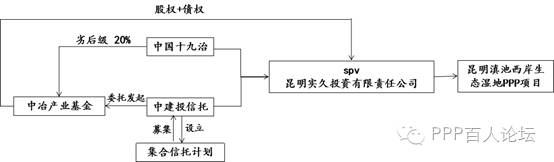 中建投信托和中国十九冶集团联合体中标昆明滇池西岸生态湿+地PPP项目。项目建设周期为24个月,总规模10亿元。联合体双方共同出资成立的SPV昆明实久投资有限责任公司,十九冶持股10%,中建投信托持股90%。