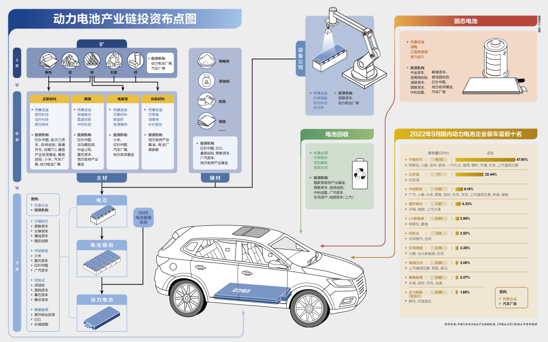 这个产业链在全球影响力也与日俱增,根据市场调研机构SNE Research发布的数据,2022年上半年全球动力电池装机量排名前十的企业中,中国企业就占6家,市场份额合计56.4%。广汽资本对动力电池上游材料供应链的版图梳理显示,包括正极、负极、电解液、隔膜等主材,还有导电剂、铜箔等辅材在内,中国材料企业的市场占比达全球的80%。