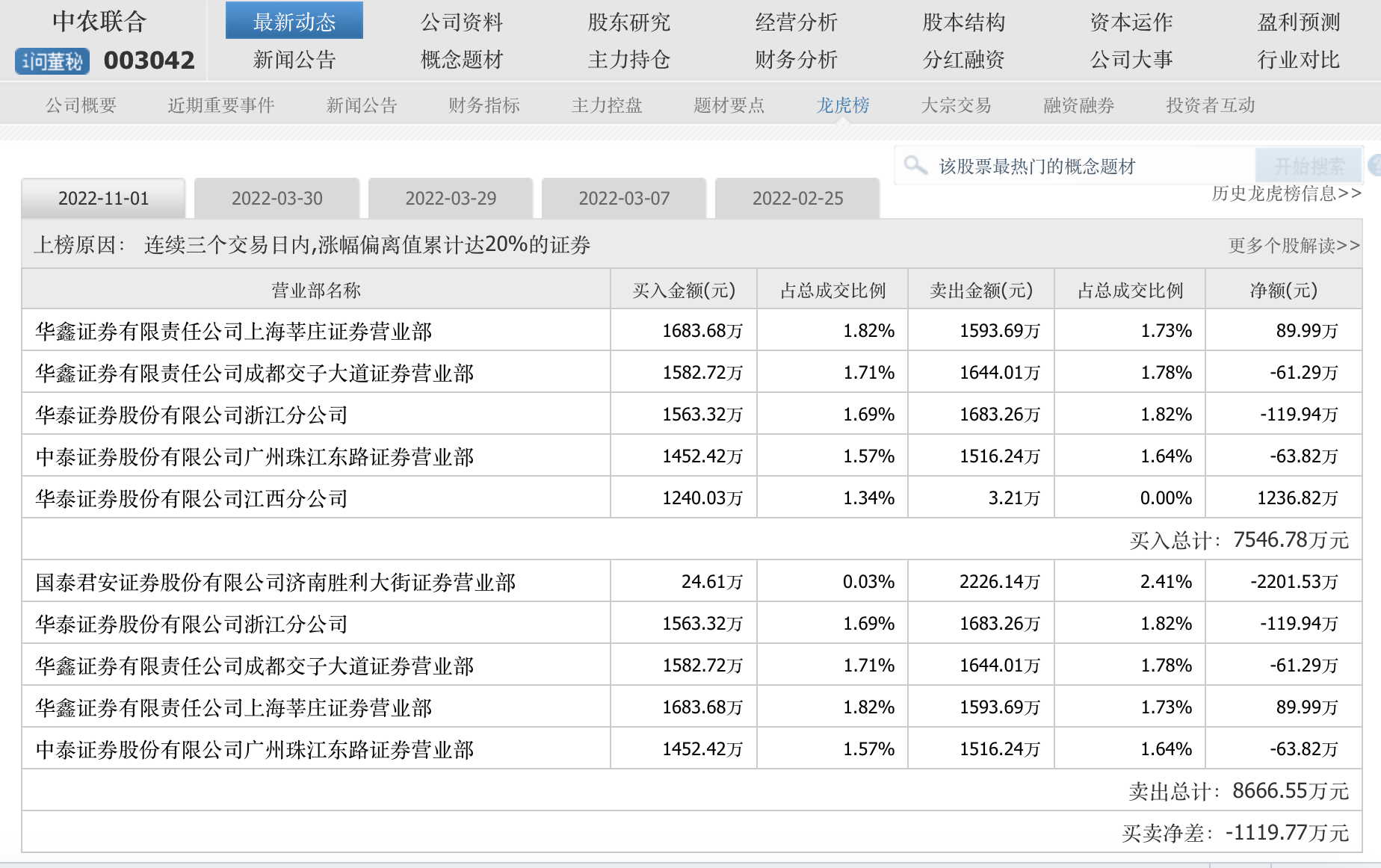 中农联合11月1日披露的连续三个交易日龙虎榜显示,买入前五有华鑫证券上海莘庄营业部、华鑫证券成都交子大道营业部、华泰证券浙江分公司、中泰证券广州珠江东路营业部、华泰证券江西分公司。