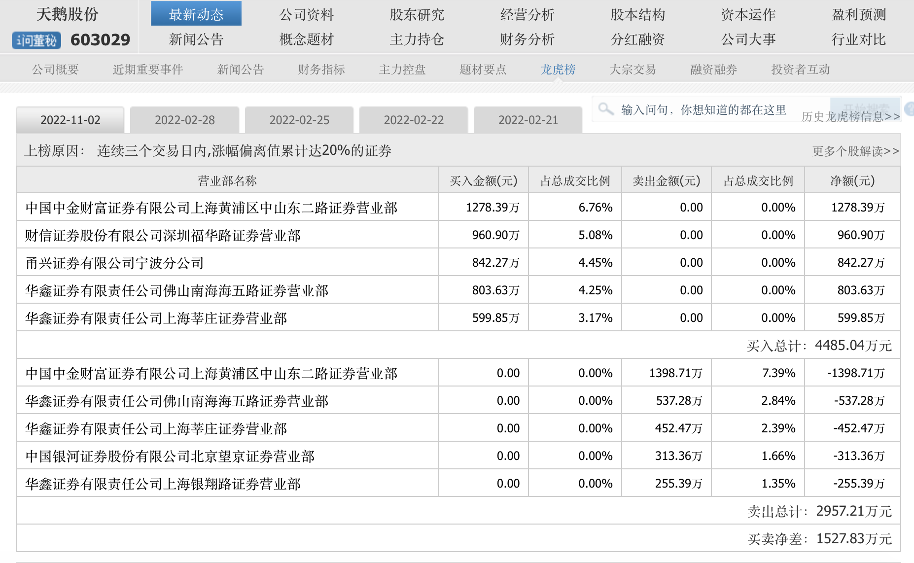无独有偶,在11月2日天鹅股份披露的连续三个交易日龙虎榜中,买入前五名单里也有华鑫证券上海莘庄营业部,另外还有中国中金财富证券上海黄浦区中山东二路营业部、财信证券深圳福华路营业部、甬兴证券宁波分公司,和华鑫证券佛山南海海五路营业部。