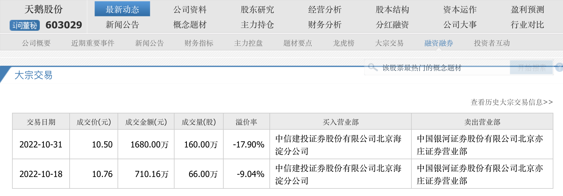 在大宗交易上,买卖也变得活跃,比如天鹅股份在10月18日和10月31日时,都有交易达成,买入者均为中信建投北京海淀分公司。