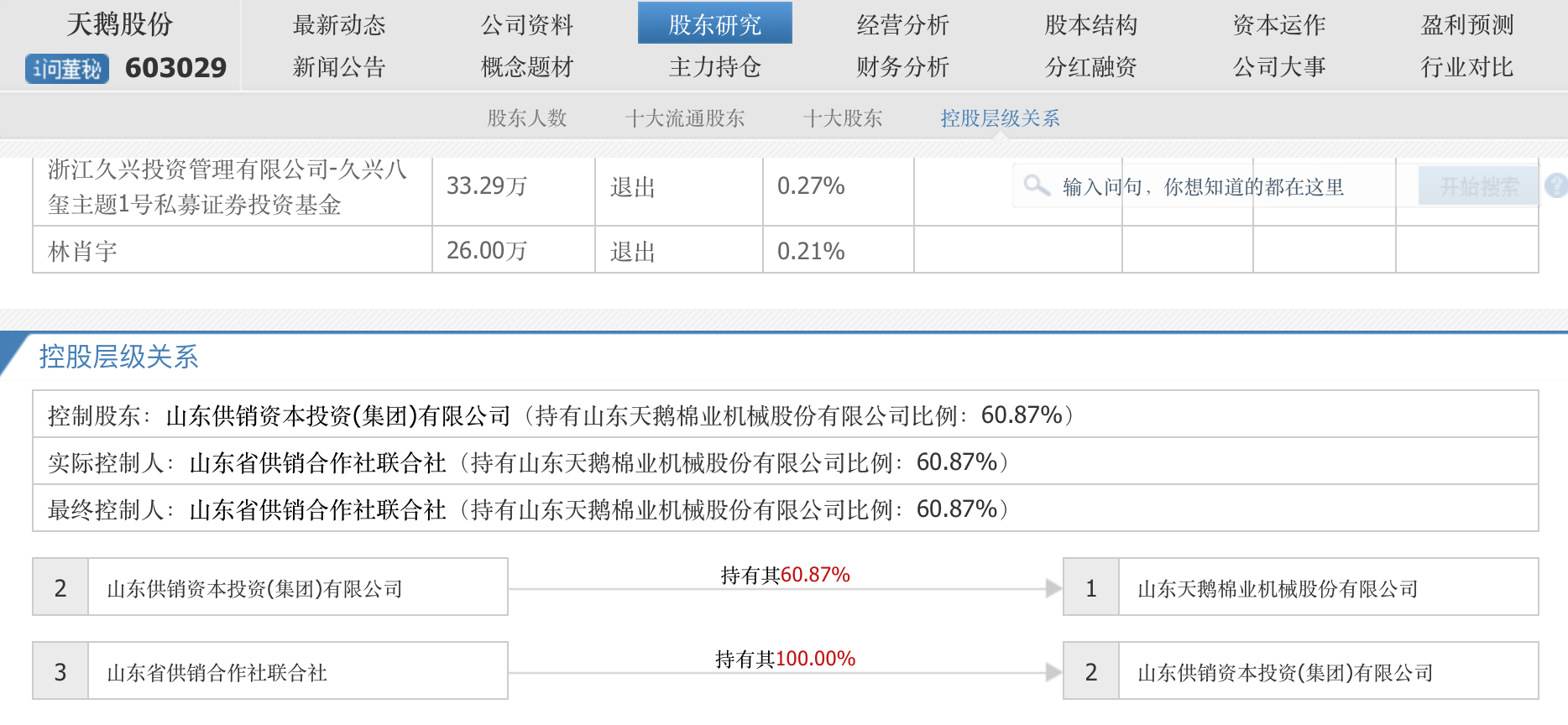 天鹅股份实际控制人为山东省供销合作社联合社,100%持股山东供销资本投资(集团)有限公司,而山东供销资本投资(集团)有限公司为天鹅股份控股股东,持股比例60.87%。