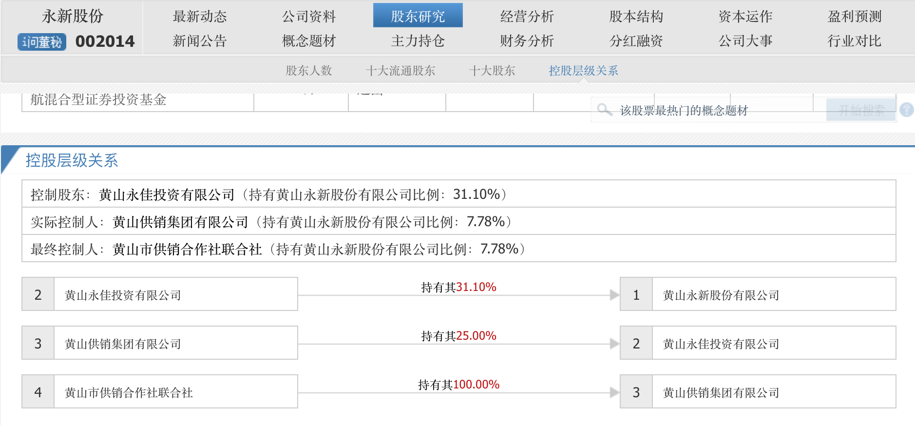 永新股份(002014.SZ)的控股股东为黄山永佳投资有限公司,实际控制人为黄山供销集团有限公司,最终控制人为黄山市供销合作社联合社。
