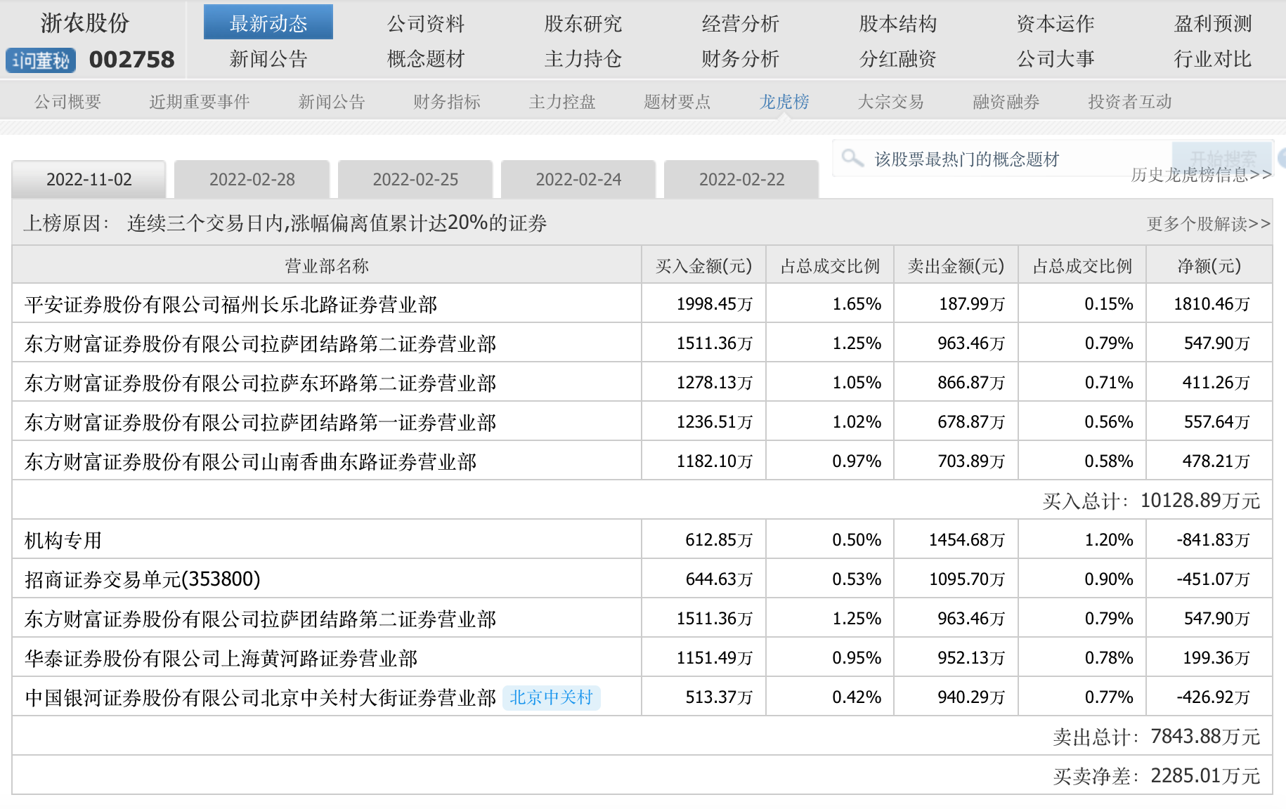 从龙虎榜看,这一概念深受游资热捧。浙农股份11月2日连续三个交易日龙虎榜显示,买入前五有平安证券福州长乐北路营业部,东方财富证券拉萨的营业部占3席,和东方财富证券山南香曲东路营业部,合计买入额上亿。