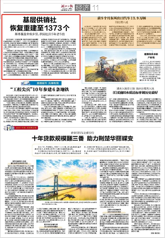 十月中旬,湖北日报就刊登了一则“恢复重建供销社”的报道,称从2015年起,湖北省便开始实施“基层社恢复重建工程”,6年过去,湖北省的基层社逐步恢复元气,基层供销社恢复重建至1373个,基本覆盖了全省乡镇,其中基层社社员达到45.2万人。