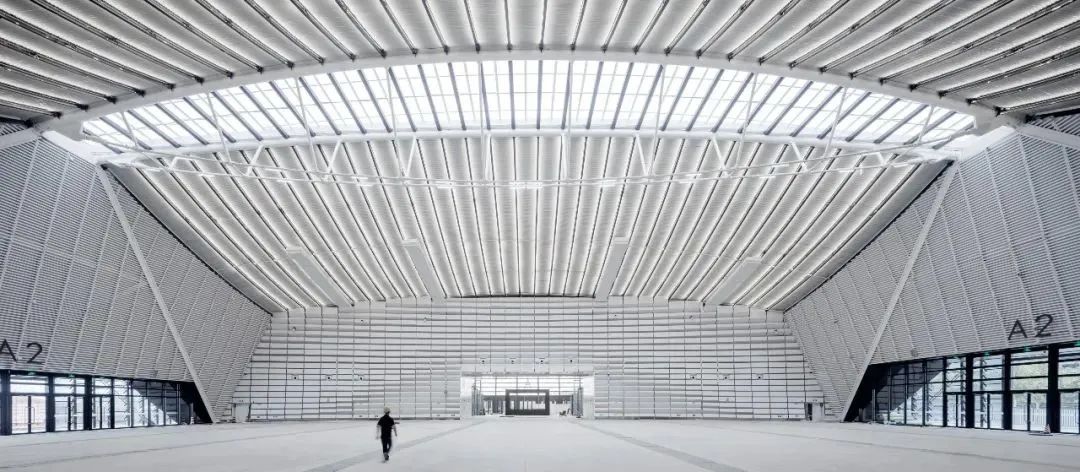 展馆自南向北划分为四个展厅以应对互联网大会和未来多元运营的功能要求,分合之间,既可以在大型展会时串联使用,又可以并联单独开启从而应对未来不同规模和性质的活动。每个展厅通过采用中高外低的空间断面,充分考虑独立展厅空间的感受和适用性。设计师将主张弦梁布置于展厅中部,利用张弦梁进行起拱,实现空间需求。同时将张弦梁在顶部打开,引入天光,进一步结合结构提升空间品质。